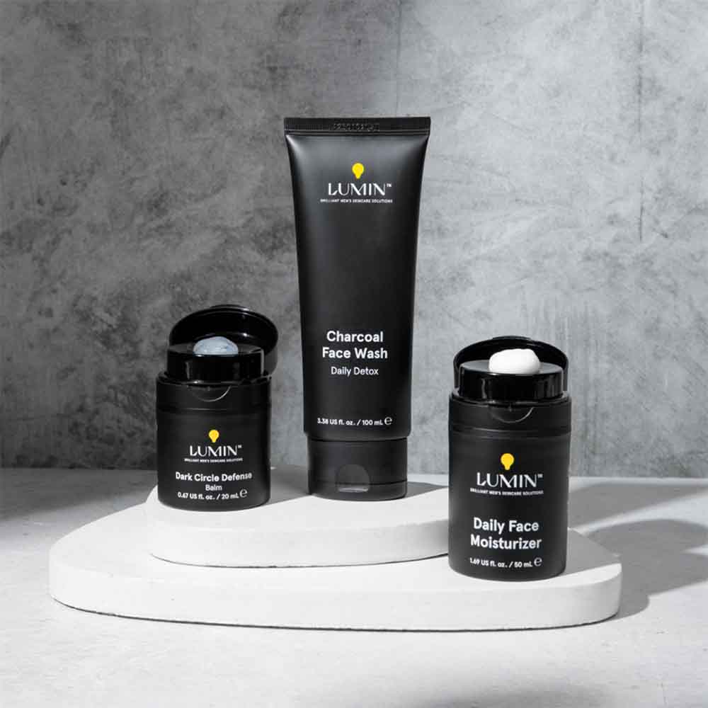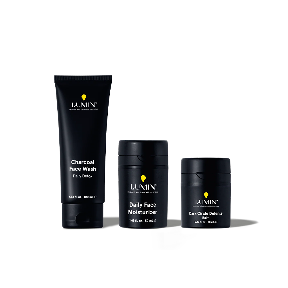 • Un kit de rutina para el cuidado de la piel para hombres que incluye los productos más vendidos para tratar las líneas finas y las ojeras.